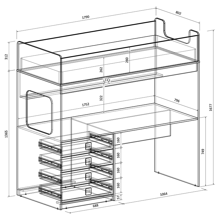 Высота кровати чердака всего 1677 мм.